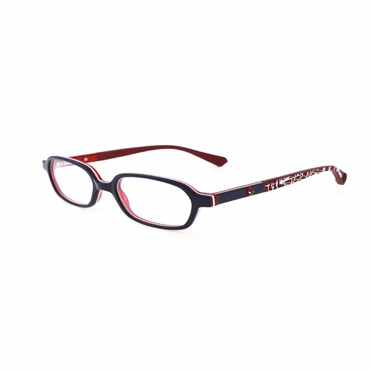 Gafa de acetato, frente en azul marino, blanco y rojo oscuro y varillas en azul marino e interior en rojo oscuro. Detalle de Spiderman. Acabado flexible para un mejor ajuste.